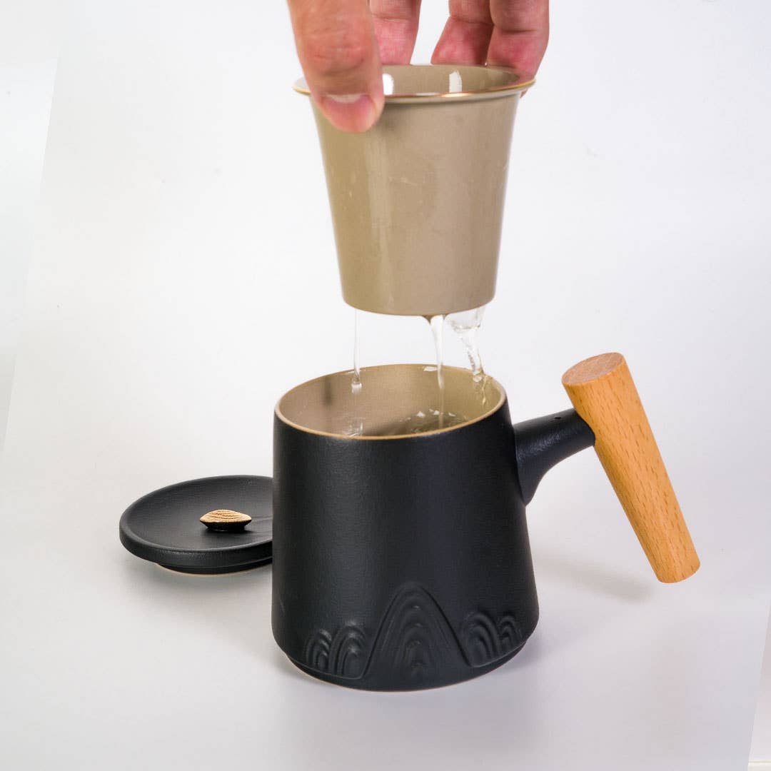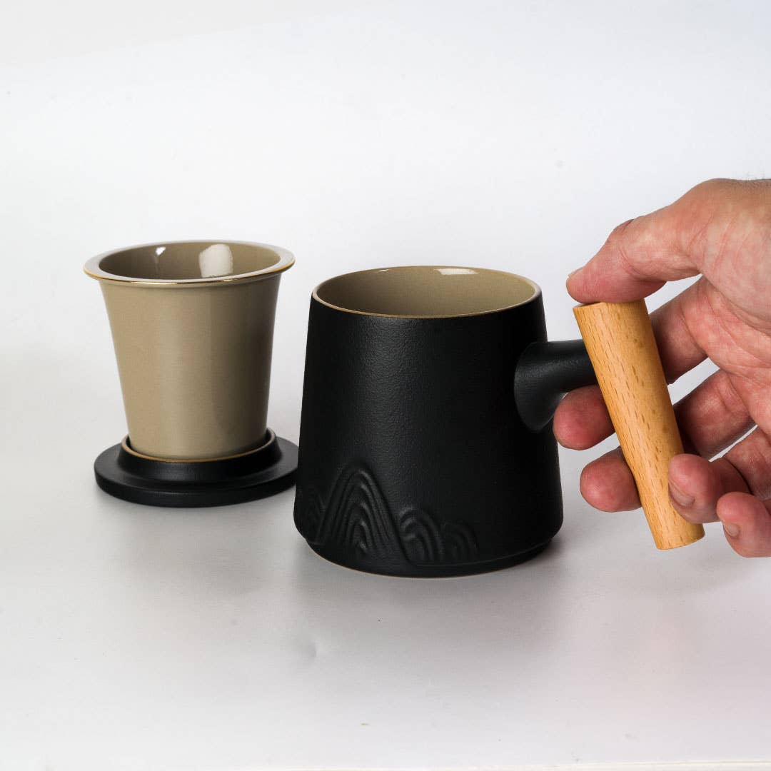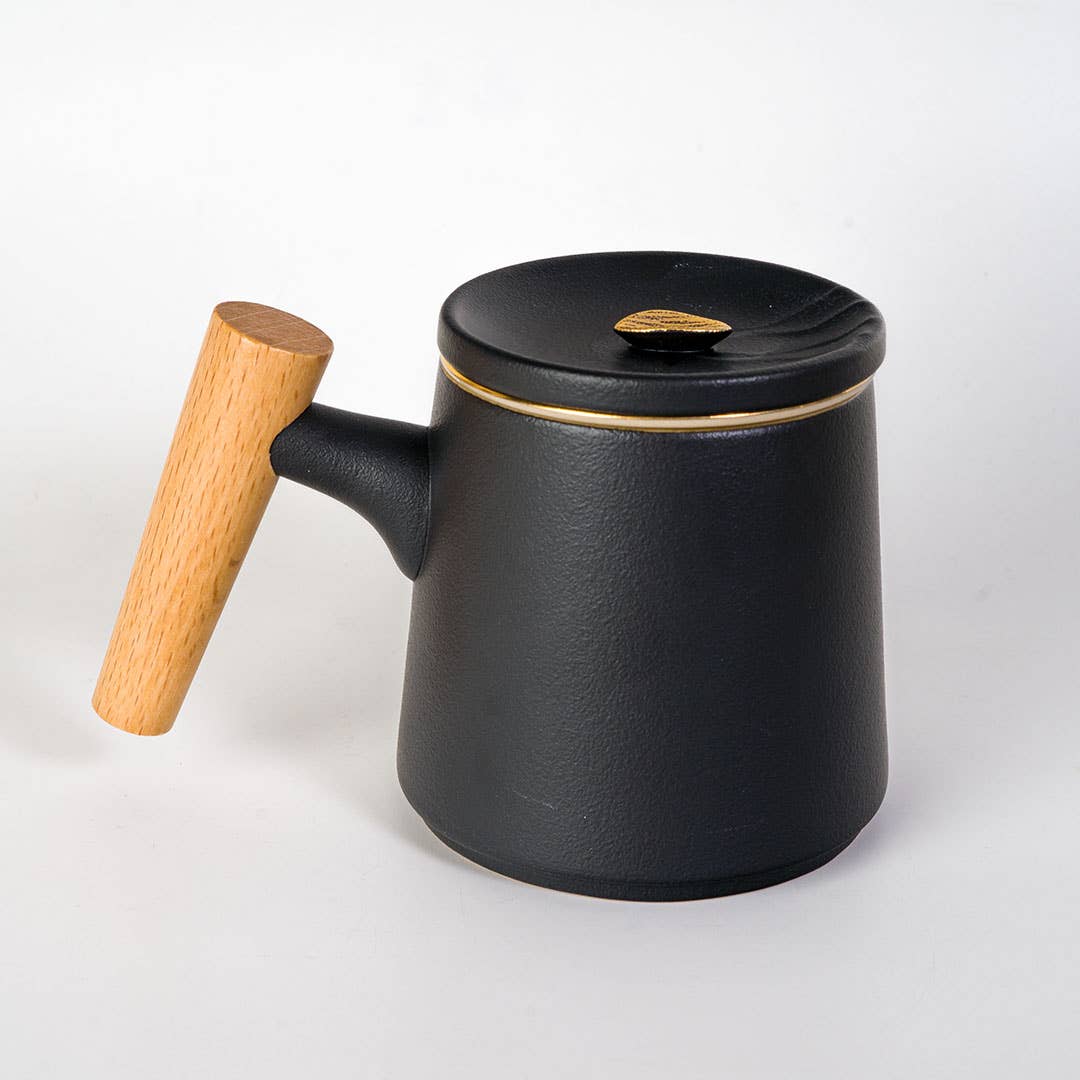 The wooden handle stays cool and adds a natural touch to the bold, minimalist design. Whether you're at your desk or winding down at home, this mug makes single-serve tea brewing effortless and elegant.