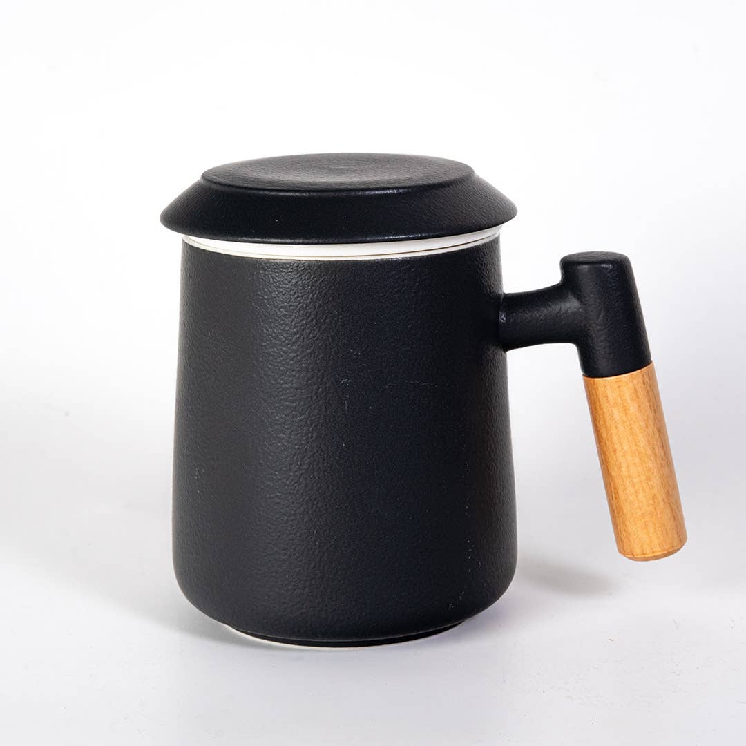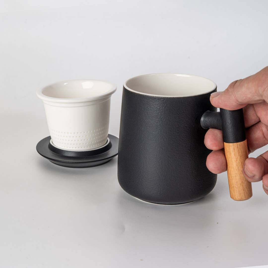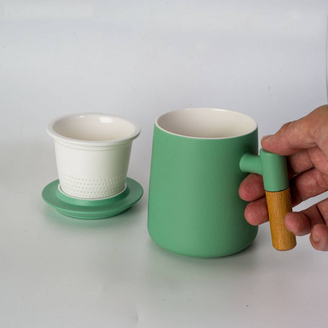 • Material: Porcelain (mug, strainer, lid); wood handle