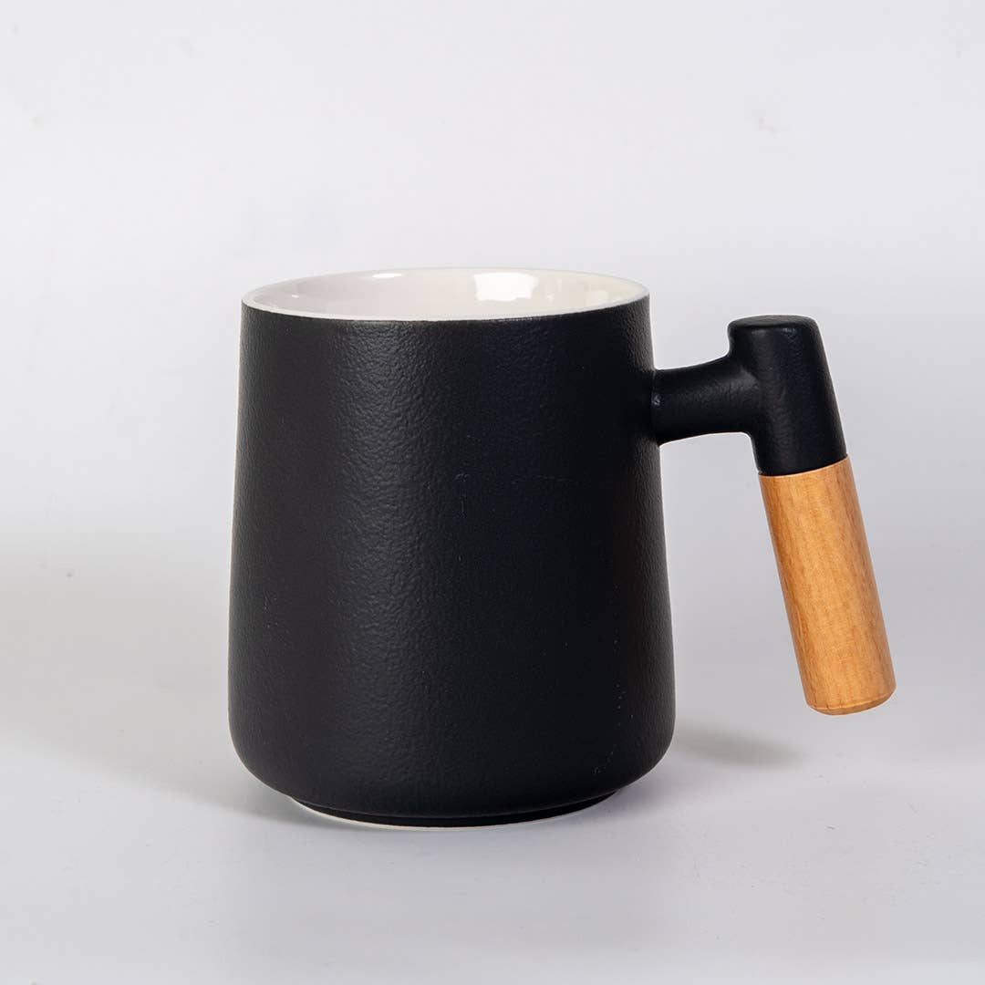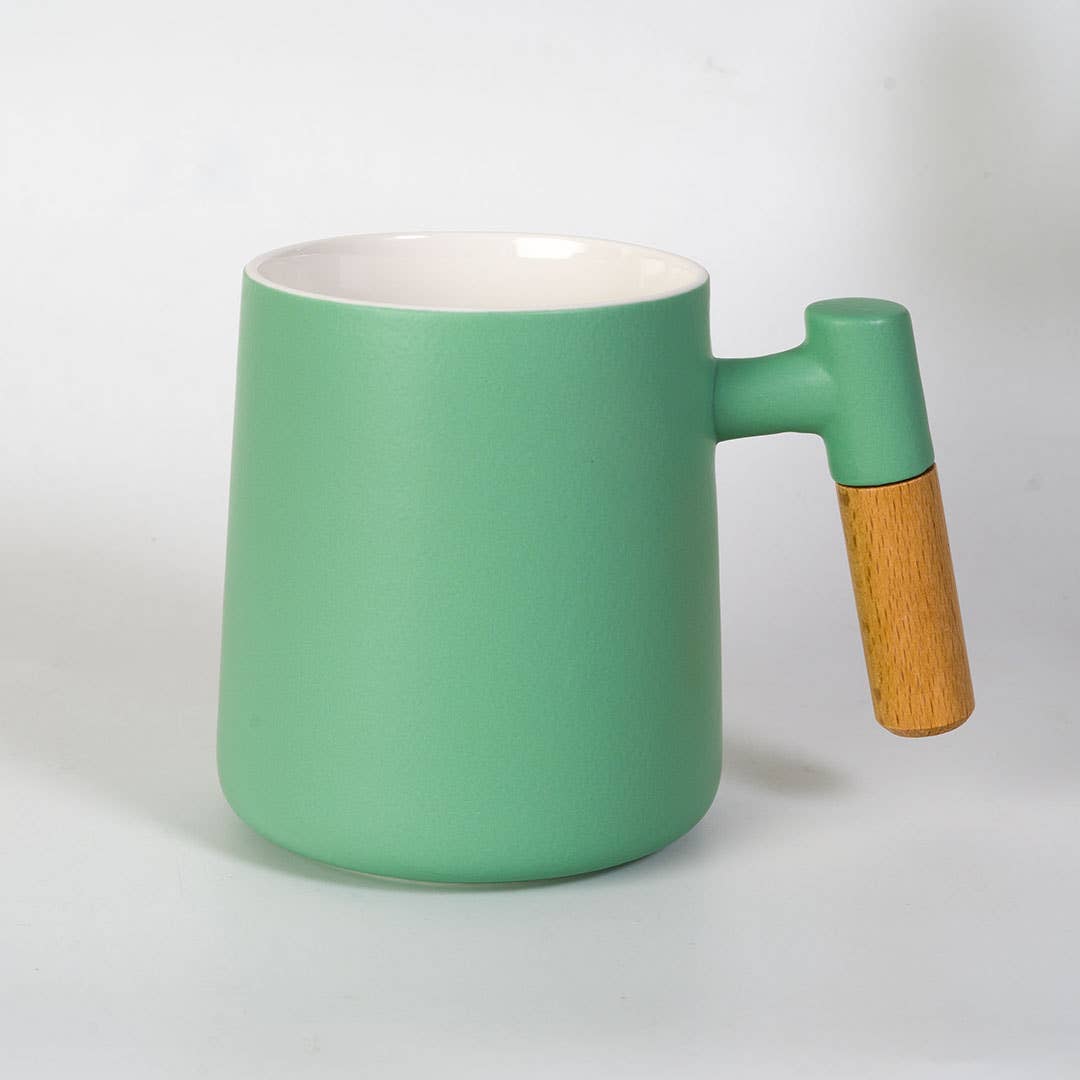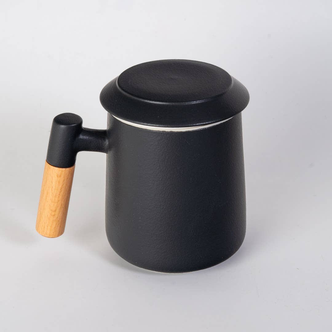 • Material: Porcelain (mug, strainer, lid); wood handle