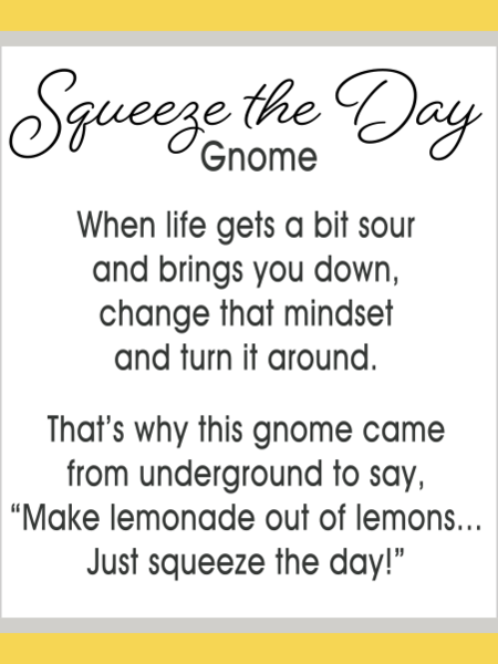 Each gnome comes with a note card that states" When Life gets a bit sour and brings you down, change that mindset and turn it around. That's why this gnome came from underground to say, Make Lemonade out of lemons... Just squeeze the day!"