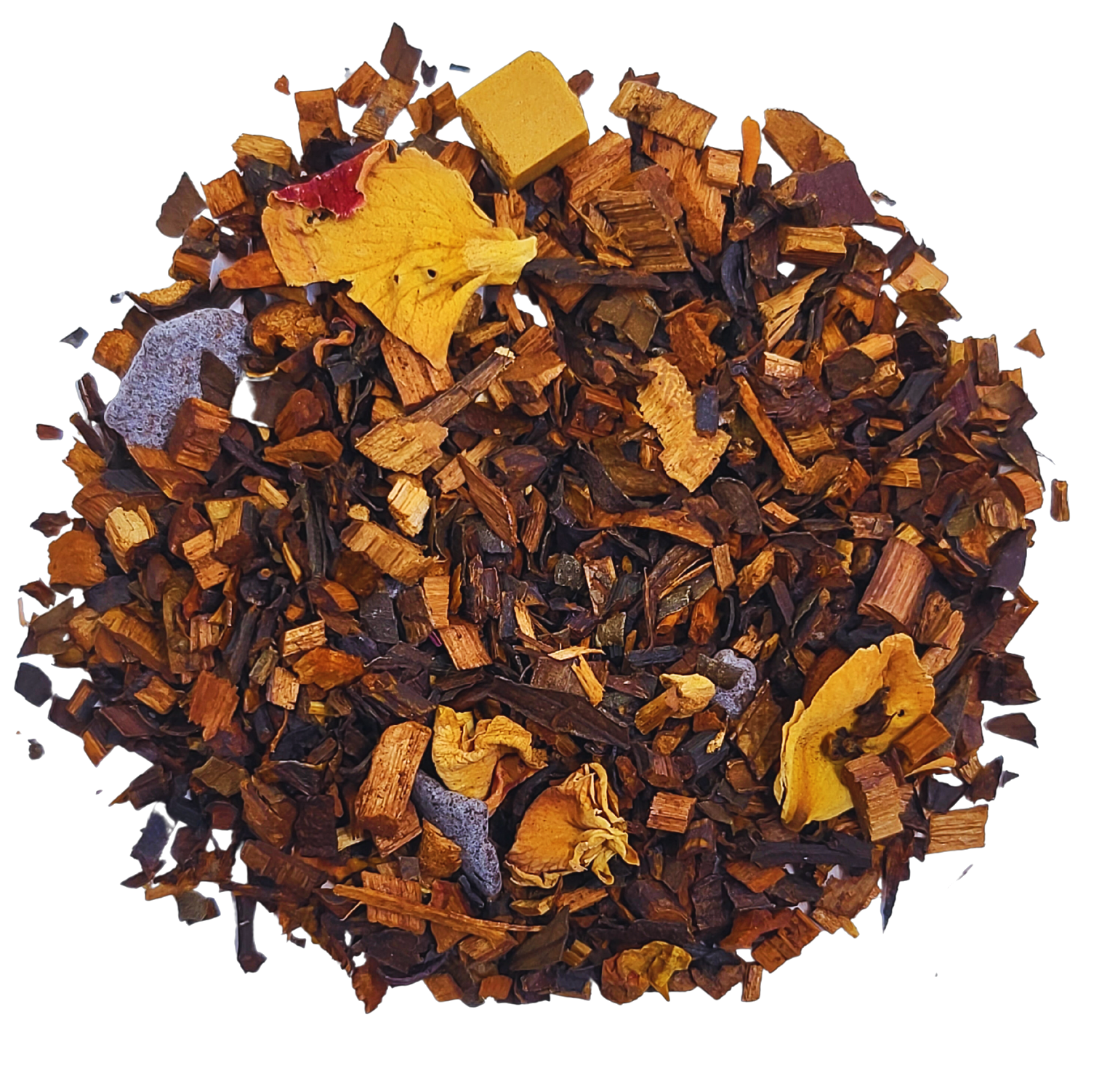 This creation is an absolute must for all chocolate fans! A roasted honeybush base with chocolate nibs and rose petals make this a favorite dessert tea.