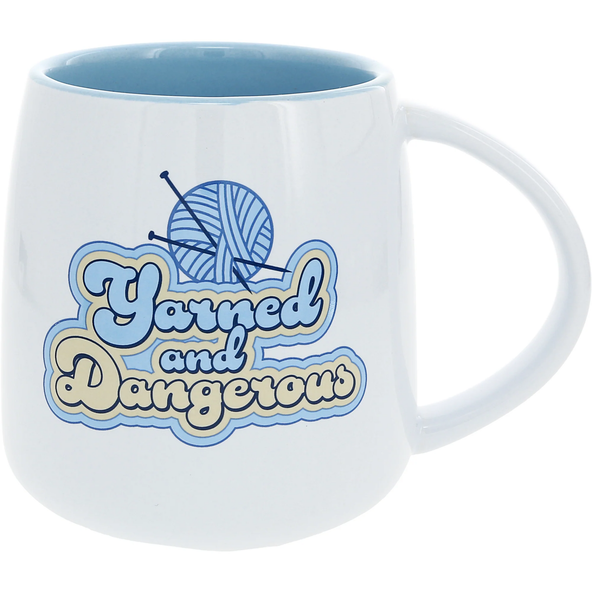 Celebrate your love for reading and knitting with this whimsical 22 oz ceramic mug. Featuring phrases like "Easily Distracted by Yarn and Books" in light blue on a matte white exterior, this high-quality stoneware mug is both durable and perfect for everyday use. The soft blue interior adds a pop of color, while glossy accents bring the design to life.