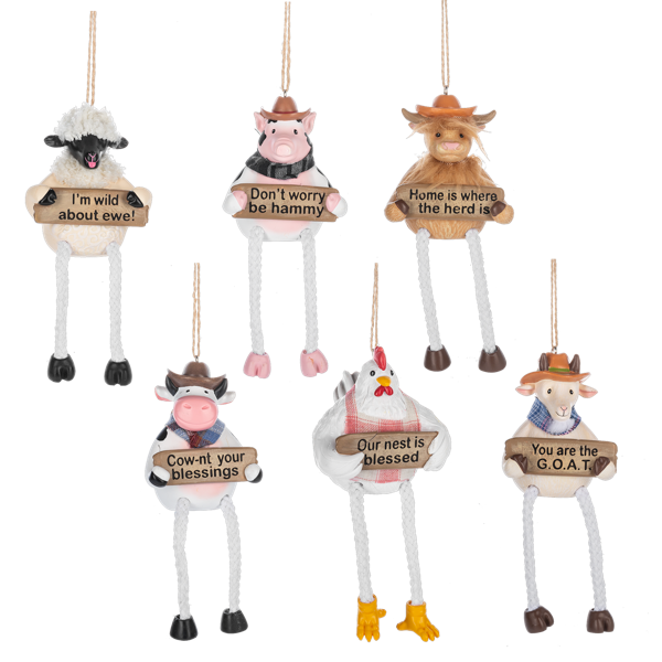 Bring a touch of farmhouse charm and laughter to your décor with these Fluffy Farm Dangle Leg Ornaments! Each adorable farm animal features a playful expression, braided rope legs that dangle freely, and a funny pun sentiment that’s sure to brighten your day.