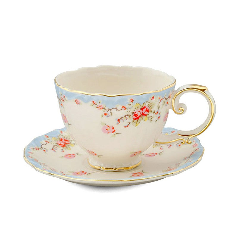 Bring timeless charm and grace to your tea moments with the Blue Vintage Rose Teacup and Saucer Set. Crafted from cream porcelain with a soft scalloped edge, this elegant 7 oz teacup is adorned with delicate pink roses, a soft blue border, and hand-applied gold trim for a truly vintage-inspired look.